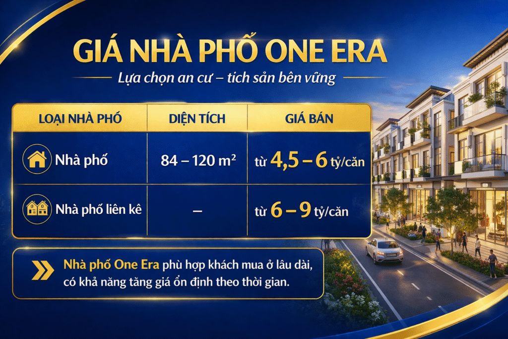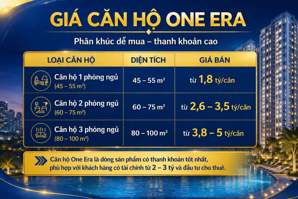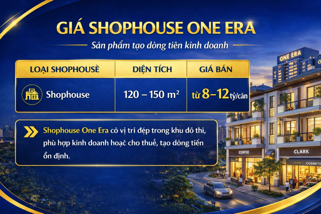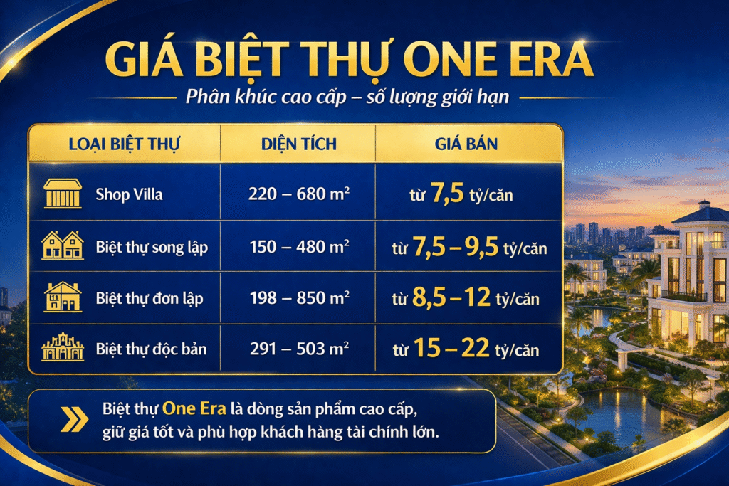 Sản phẩm One Era được phát triển đa dạng từ căn hộ đến nhà phố, shophouse và biệt thự, với mức giá trải dài từ 1,8 tỷ đến hơn 20 tỷ. Đây là điểm mạnh giúp dự án One Era phù hợp với nhiều nhóm khách hàng, từ người mua ở đến nhà đầu tư.