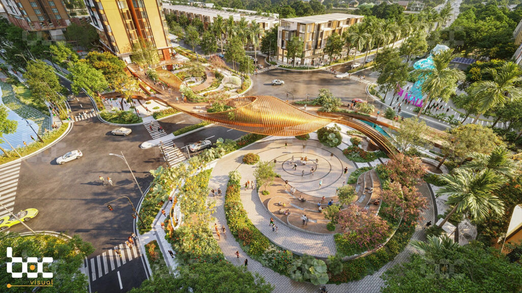 - Công viên, hồ cảnh quan, mảng xanh, không gian đi bộ, khu sinh hoạt cộng đồng, vườn thảo mộc và khu vui chơi trẻ em